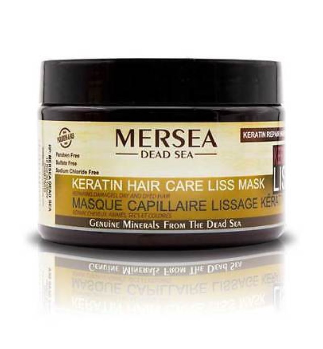 Mersea Dead Sea - Keratinová vyhlazovací maska na suché / barevné vlasy. Výrobce: Izrael.Maska MERSEA Dead sea je na suché poškozené, kudrnate, vlnité nebo křepate vlasy. Může poskytnout dodatečnou hydrataci, vyhlazování, lesk a kompletní péči o vaše vlasy. Je viditelný výsledek ihned po prvním mytí. Je obohacen o keratin a minerály z Mrtvého moře..Keratin injektovaný hluboko do vlasů, rekonstruuje vnitřní strukturu vlákna. Vlasy jsou okamžitě jemnější, lesklé, hedvábné, měkčí a lépe chráněné. Neobsahuje parabeny.Použití:Po myti šampionem naneste na vlhké vlasy na délky a konce. Nechejte 10 až 20 minut a důkladně opláchněte. Používá se navíc k šampónu MERSEA R